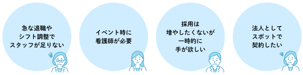 保育園・幼稚園、障害者施設、高齢者施設など、急な欠員や繁忙期に経験豊富な看護師を派遣します。